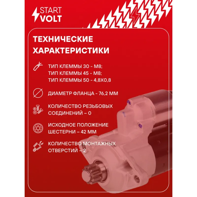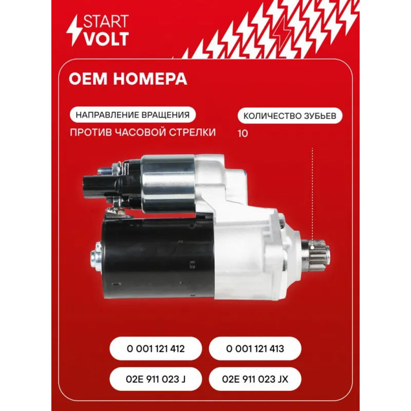 Стартер для автомобилей VAG Octavia A5 (04-) 2.0TFSi 1кВт Описание: Оригинальный стартер STARTVOLT LSt 1843 мощностью 1 кВт предназначен для пуска автомобильного двигателя внутреннего сгорания. Предназначен для автомобилей AUDI A3, TT, SEAT TOLEDO, LEON, ALTEA, SKODA OCTAVIA, VW TOURAN, SCIROCCO, JETTA, GOLF, GOLF PLUS, EOS.. Подбор по VIN-номеру вашего автомобиля - через кнопку 'Задать вопрос'. Специалист проверит применяемость и ответит вам. Полностью повторяет параметры оригинальных изделий, обеспечивая надёжный запуск двигателя при любых условиях. Изготовлен с соблюдением оригинальных геометрических параметров, полностью совместим с заводскими узлами. Преимущества: • Полное соответствие оригинальным узлам; • Совместим с оригинальными деталями; • Длительный срок службы и устойчивость к износу; • Стабильная работа системы запуска; • Высокоточная сборка с пооперационным контролем качества; • Каждый стартер проходит стендовое тестирование — протокол в комплекте; • Надёжность при любом запуске двигателя; • STARTVOLT — 15 лет на рынке автоэлектрики — нам доверяют профессионалы; • Сертифицирован по стандарту EAC (ЕАЭС) — соответствует требованиям безопасности и качества. Товар новый, не восстановленный. Готов к установке. Отличный выбор для уверенного запуска двигателя в любых условиях. Характеристики: Артикул: LSt 1843 OEM номера: 02E 911 023 J, 02E 911 023 JX, 0 001 121 412, 0 001 121 413 Количество зубьев: 10 Направление вращения: против часовой стрелки Мощность, кВт: 1 Тип клеммы 30: M8 Тип клеммы 45: M8 Тип клеммы 50: 4,8x0,8 Количество резьбовых соединений: 0 Диаметр фланца, мм: 76,2 Исходное положение шестерни, мм: 42 Количество монтажных отверстий: 2 Количество на автомобиль: 1 Номинальное напряжение, В: 12 Комплектация: Индивидуальный технический паспорт - 1 шт Стартер - 1 шт Паспорт изделия/гарантийный талон - 1 шт Гарантия: от 1 года.