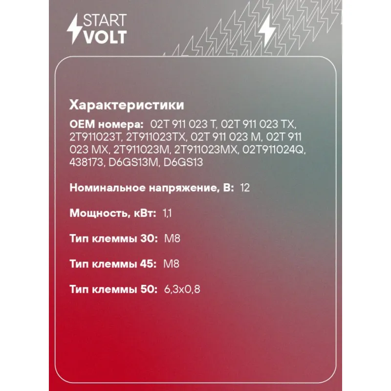 Стартер для автомобилей VAG Octavia A5 (04-)/Golf V (04-)/Jetta (04-) 1.6i 1,1кВт Описание: Оригинальный стартер STARTVOLT LSt 1820 мощностью 1,1 кВт предназначен для пуска автомобильного двигателя внутреннего сгорания. Предназначен для автомобилей AUDI A3, SEAT ALTEA, CORDOBA, IBIZA, LEON, TOLEDO, SKODA FABIA, OCTAVIA, VW JETTA, GOLF PLUS, GOLF.. Подбор по VIN-номеру вашего автомобиля - через кнопку 'Задать вопрос'. Специалист проверит применяемость и ответит вам. Полностью повторяет параметры оригинальных изделий, обеспечивая надёжный запуск двигателя при любых условиях. Изготовлен с соблюдением оригинальных геометрических параметров, полностью совместим с заводскими узлами. Преимущества: • Полное соответствие оригинальным узлам; • Совместим с оригинальными деталями; • Длительный срок службы и устойчивость к износу; • Стабильная работа системы запуска; • Высокоточная сборка с пооперационным контролем качества; • Каждый стартер проходит стендовое тестирование — протокол в комплекте; • Надёжность при любом запуске двигателя; • STARTVOLT — 15 лет на рынке автоэлектрики — нам доверяют профессионалы; • Сертифицирован по стандарту EAC (ЕАЭС) — соответствует требованиям безопасности и качества. Товар новый, не восстановленный. Готов к установке. Отличный выбор для уверенного запуска двигателя в любых условиях. Характеристики: Артикул: LSt 1820 OEM номера: 02T 911 023 T, 02T 911 023 TX, 2T911023T, 2T911023TX, 02T 911 023 M, 02T 911 023 MX, 2T911023M, 2T911023MX, 02T911024Q, 438173, D6GS13M, D6GS13 Номинальное напряжение, В: 12 Количество зубьев: 10 Направление вращения: против часовой стрелки Мощность, кВт: 1,1 Тип клеммы 30: M8 Тип клеммы 45: M8 Тип клеммы 50: 6,3x0,8 Количество резьбовых соединений: 0 Диаметр фланца, мм: 76,2 Исходное положение шестерни, мм: 52 Сопутствующий товар: Щёточные узлы: VBS 0907 Сопутствующий товар: Роторы: SR 1815 Количество монтажных отверстий: 2 Количество на автомобиль: 1 Подходит для авто: Skoda Octavia A5 (04-), Fabia II (07-), Octavia A5 (04-) Volkswagen Golf Plus (05-), Golf VI (08-), Jetta (11-), Golf V (03-), Jetta (05-) Audi A3 (03-) Seat Altea (04-) Для проверки применяемости отправьте VIN автомобиля через вкладку "Есть вопросы о товаре?" Комплектация: Индивидуальный технический паспорт - 1 шт Стартер - 1 шт Паспорт изделия/гарантийный талон - 1 шт Гарантия: от 1 года.