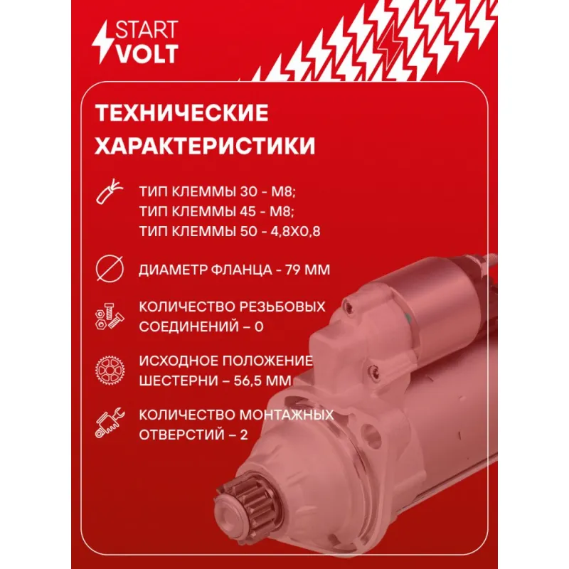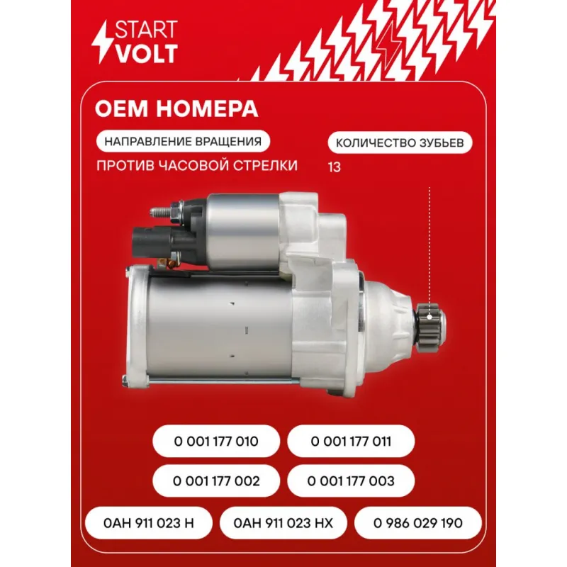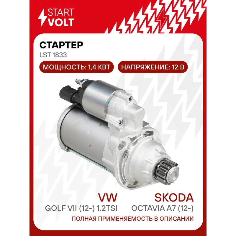 Стартер для автомобилей VAG Octavia A7 (12-)/Golf VII (12-) 1.2TSI 1,4кВт Описание: Оригинальный стартер STARTVOLT LSt 1833 мощностью 1,4 кВт предназначен для пуска автомобильного двигателя внутреннего сгорания. Предназначен для автомобилей AUDI A3, SEAT LEON, SKODA OCTAVIA, VW GOLF, CADDY.. Подбор по VIN-номеру вашего автомобиля - через кнопку 'Задать вопрос'. Специалист проверит применяемость и ответит вам. Полностью повторяет параметры оригинальных изделий, обеспечивая надёжный запуск двигателя при любых условиях. Изготовлен с соблюдением оригинальных геометрических параметров, полностью совместим с заводскими узлами. Преимущества: • Полное соответствие оригинальным узлам; • Совместим с оригинальными деталями; • Длительный срок службы и устойчивость к износу; • Стабильная работа системы запуска; • Высокоточная сборка с пооперационным контролем качества; • Каждый стартер проходит стендовое тестирование — протокол в комплекте; • Надёжность при любом запуске двигателя; • STARTVOLT — 15 лет на рынке автоэлектрики — нам доверяют профессионалы; • Сертифицирован по стандарту EAC (ЕАЭС) — соответствует требованиям безопасности и качества. Товар новый, не восстановленный. Готов к установке. Отличный выбор для уверенного запуска двигателя в любых условиях. Характеристики: Артикул: LSt 1833 OEM номера: 0AH 911 023 H, 0AH 911 023 HX, 0 986 029 190, 0 001 177 002, 0 001 177 003, 0 001 177 010, 0 001 177 011 Количество зубьев: 13 Направление вращения: против часовой стрелки Мощность, кВт: 1,4 Тип клеммы 30: M8 Тип клеммы 45: M8 Тип клеммы 50: 4,8x0,8 Количество резьбовых соединений: 0 Диаметр фланца, мм: 79 Исходное положение шестерни, мм: 56,5 Количество монтажных отверстий: 2 Количество на автомобиль: 1 Номинальное напряжение, В: 12 Комплектация: Индивидуальный технический паспорт - 1 шт Стартер - 1 шт Паспорт изделия/гарантийный талон - 1 шт Гарантия: от 1 года.