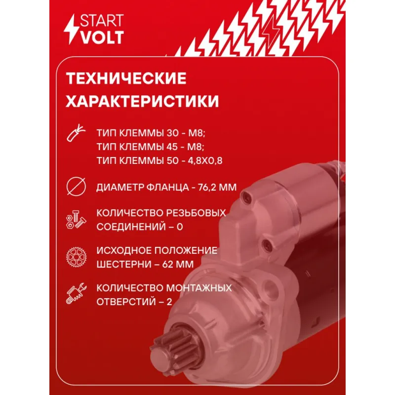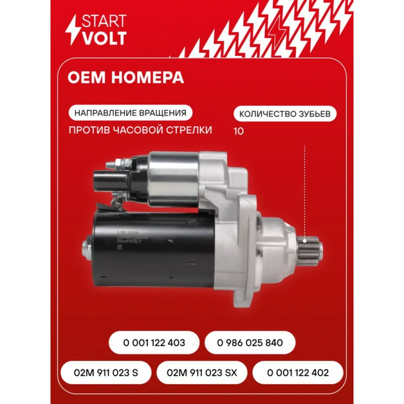 Стартер для автомобилей VAG Polo Sedan (10-) 1.6i AT 1,4кВт Описание: Оригинальный стартер STARTVOLT LSt 1824 мощностью 1,4 кВт предназначен для пуска автомобильного двигателя внутреннего сгорания. Предназначен для автомобилей AUDI TT, VW BEETLE, GOLF, JETTA, NEW BEETLE, POLO.. Подбор по VIN-номеру вашего автомобиля - через кнопку 'Задать вопрос'. Специалист проверит применяемость и ответит вам. Полностью повторяет параметры оригинальных изделий, обеспечивая надёжный запуск двигателя при любых условиях. Изготовлен с соблюдением оригинальных геометрических параметров, полностью совместим с заводскими узлами. Преимущества: • Полное соответствие оригинальным узлам; • Совместим с оригинальными деталями; • Длительный срок службы и устойчивость к износу; • Стабильная работа системы запуска; • Высокоточная сборка с пооперационным контролем качества; • Каждый стартер проходит стендовое тестирование — протокол в комплекте; • Надёжность при любом запуске двигателя; • STARTVOLT — 15 лет на рынке автоэлектрики — нам доверяют профессионалы; • Сертифицирован по стандарту EAC (ЕАЭС) — соответствует требованиям безопасности и качества. Товар новый, не восстановленный. Готов к установке. Отличный выбор для уверенного запуска двигателя в любых условиях. Характеристики: Артикул: LSt 1824 OEM номера: 02M 911 023 S, 02M 911 023 SX, 0 001 122 402, 0 001 122 403, 0 986 025 840 Номинальное напряжение, В: 12 Количество зубьев: 10 Направление вращения: против часовой стрелки Мощность, кВт: 1,4 Тип клеммы 30: M8 Тип клеммы 45: M8 Тип клеммы 50: 4,8x0,8 Количество резьбовых соединений: 0 Диаметр фланца, мм: 76,2 Исходное положение шестерни, мм: 62 Сопутствующий товар: Втягивающие реле: VSR 1002 Сопутствующий товар: Щёточные узлы: VBS 1002 Сопутствующий товар: Приводы стартеров (бендиксы): VCS 1824 Количество монтажных отверстий: 2 Количество на автомобиль: 1 Подходит для авто: Volkswagen Polo Sedan (RUS) (10-) Для проверки применяемости отправьте VIN автомобиля через вкладку "Есть вопросы о товаре?" Комплектация: Индивидуальный технический паспорт - 1 шт Стартер - 1 шт Паспорт изделия/гарантийный талон - 1 шт Гарантия: от 1 года.