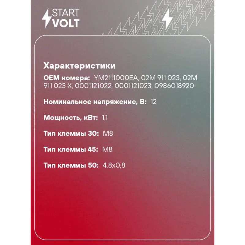 Стартер для автомобилей VAG Sharan (95-) 1.8T/2.0i 1,1кВт Характеристики: Артикул: LSt 1893 OEM номера: YM2111000EA, 02M 911 023, 02M 911 023 X, 0001121022, 0001121023, 0986018920 Номинальное напряжение, В: 12 Количество зубьев: 10 Направление вращения: против часовой стрелки Мощность, кВт: 1,1 Тип клеммы 30: M8 Тип клеммы 45: M8 Тип клеммы 50: 4,8x0,8 Количество резьбовых соединений: 0 Диаметр фланца, мм: 76,2 Исходное положение шестерни, мм: 62 Количество монтажных отверстий: 2 Количество на автомобиль: 1 Комплектация: Индивидуальный технический паспорт - 1 шт Стартер - 1 шт Паспорт изделия/гарантийный талон - 1 шт Гарантия: от 1 года.