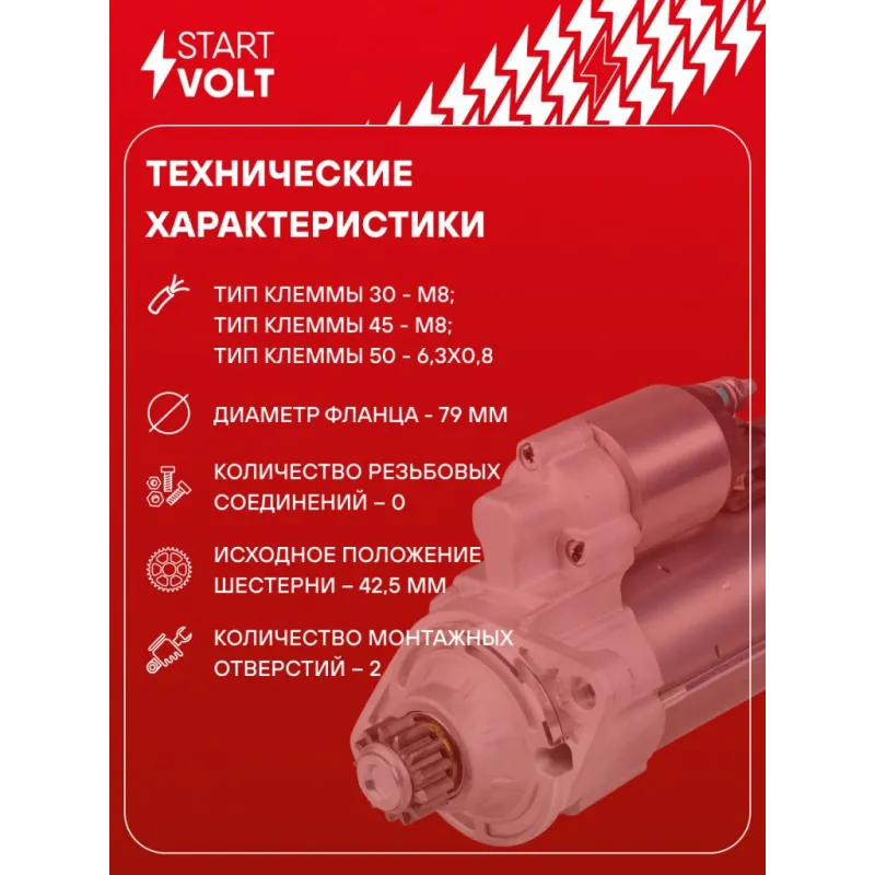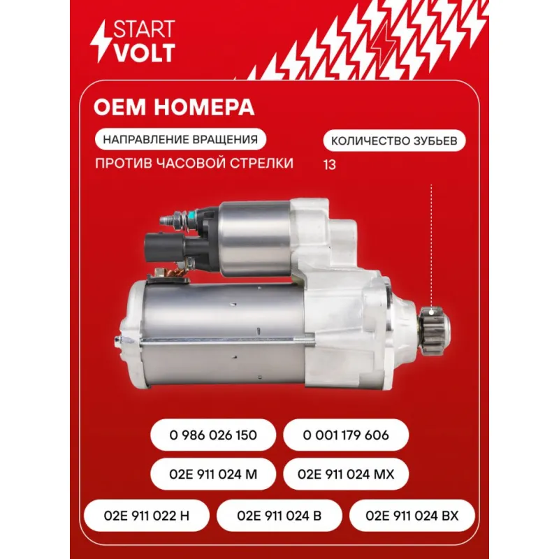 Стартер для автомобилей VAG Tiguan (16-)/Kodiaq (16-) 1.4TSI/2.0TSI 1,6кВт Описание: Оригинальный стартер STARTVOLT LSt 1868 мощностью 1,6 кВт предназначен для пуска автомобильного двигателя внутреннего сгорания. Предназначен для автомобилей AUDI TT, Q3, A3, MITSUBISHI LANCER, SEAT ALHAMBRA, ATECA, LEON, TARRACO, SKODA KAROQ, KODIAQ, OCTAVIA, SUPERB, FABIA, SKODA (SVW) KODIAQ, VW TIGUAN, T-ROC, SHARAN, SCIROCCO, POLO, CC, PASSAT, T6, GOLF, CADDY, BEETLE, ARTEON, T5.. Подбор по VIN-номеру вашего автомобиля - через кнопку 'Задать вопрос'. Специалист проверит применяемость и ответит вам. Полностью повторяет параметры оригинальных изделий, обеспечивая надёжный запуск двигателя при любых условиях. Изготовлен с соблюдением оригинальных геометрических параметров, полностью совместим с заводскими узлами. Преимущества: • Полное соответствие оригинальным узлам; • Совместим с оригинальными деталями; • Длительный срок службы и устойчивость к износу; • Стабильная работа системы запуска; • Высокоточная сборка с пооперационным контролем качества; • Каждый стартер проходит стендовое тестирование — протокол в комплекте; • Надёжность при любом запуске двигателя; • STARTVOLT — 15 лет на рынке автоэлектрики — нам доверяют профессионалы; • Сертифицирован по стандарту EAC (ЕАЭС) — соответствует требованиям безопасности и качества. Товар новый, не восстановленный. Готов к установке. Отличный выбор для уверенного запуска двигателя в любых условиях. Характеристики: Артикул: LSt 1868 OEM номера: 02E 911 022 H, 02E 911 024 B, 02E 911 024 BX, 02E 911 024 M, 02E 911 024 MX, 0 986 026 150, 0 001 179 606 Номинальное напряжение, В: 12 Количество зубьев: 13 Направление вращения: против часовой стрелки Мощность, кВт: 1,6 Тип клеммы 30: M8 Тип клеммы 45: M8 Тип клеммы 50: 6,3x0,8 Количество резьбовых соединений: 0 Диаметр фланца, мм: 79 Исходное положение шестерни, мм: 42,5 Сопутствующий товар: Втягивающие реле: VSR 1805 Сопутствующий товар: Щёточные узлы: VBS 1805 Сопутствующий товар: Приводы стартеров (бендиксы): VCS 1804 Сопутствующий товар: Роторы: SR 1868 Количество монтажных отверстий: 2 Количество на автомобиль: 1 Подходит для авто: Audi A3 (12-), Q3 (11-), Q3 (11-), TT (14-) Volkswagen Beetle (10-), Golf VII (12-), Multivan (03-), Scirocco (08-), Transporter T6 (15-), Arteon (17-), Caddy (04-), Golf VI (08-), Passat B7 (10-), Tiguan (16-) Skoda Kodiaq (16-), Octavia A7 (13-), Karoq (17-), Kodiaq (16-) Seat Ateca (16-), Leon (12-) Mitsubishi Lancer (91-) Для проверки применяемости отправьте VIN автомобиля через вкладку "Есть вопросы о товаре?" Комплектация: Индивидуальный технический паспорт - 1 шт Стартер - 1 шт Паспорт изделия/гарантийный талон - 1 шт Гарантия: от 1 года.