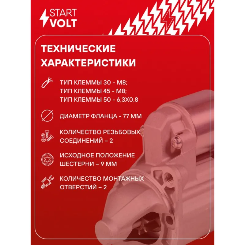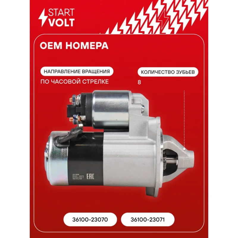 Стартер для автомобилейKia Sportage II (04-)/Ceed (06-) 1.6i/2.0i 1,2кВт Описание: Оригинальный стартер STARTVOLT LSt 0839 мощностью 1,2 кВт предназначен для пуска автомобильного двигателя внутреннего сгорания. Предназначен для автомобилей HYUNDAI COUPE, ELANTRA, i30, KIA SPORTAGE, CEED.. Подбор по VIN-номеру вашего автомобиля - через кнопку 'Задать вопрос'. Специалист проверит применяемость и ответит вам. Полностью повторяет параметры оригинальных изделий, обеспечивая надёжный запуск двигателя при любых условиях. Изготовлен с соблюдением оригинальных геометрических параметров, полностью совместим с заводскими узлами. Преимущества: • Полное соответствие оригинальным узлам; • Совместим с оригинальными деталями; • Длительный срок службы и устойчивость к износу; • Стабильная работа системы запуска; • Высокоточная сборка с пооперационным контролем качества; • Каждый стартер проходит стендовое тестирование — протокол в комплекте; • Надёжность при любом запуске двигателя; • STARTVOLT — 15 лет на рынке автоэлектрики — нам доверяют профессионалы; • Сертифицирован по стандарту EAC (ЕАЭС) — соответствует требованиям безопасности и качества. Товар новый, не восстановленный. Готов к установке. Отличный выбор для уверенного запуска двигателя в любых условиях. Характеристики: Артикул: LSt 0839 OEM номера: 36100-23070, 36100-23071 Номинальное напряжение, В: 12 Количество зубьев: 8 Направление вращения: по часовой стрелке Мощность, кВт: 1,2 Тип клеммы 30: M8 Тип клеммы 45: M8 Тип клеммы 50: 6,3x0,8 Количество резьбовых соединений: 2 Диаметр фланца, мм: 77 Исходное положение шестерни, мм: 9 Сопутствующий товар: Втягивающие реле: VSR 0819 Сопутствующий товар: Щёточные узлы: VBS 2704 Сопутствующий товар: Приводы стартеров (бендиксы): VCS 0891 Сопутствующий товар: Роторы: SR 0839 Количество монтажных отверстий: 2 Количество на автомобиль: 1 Комплектация: Индивидуальный технический паспорт - 1 шт Стартер - 1 шт Паспорт изделия/гарантийный талон - 1 шт Гарантия: от 1 года.