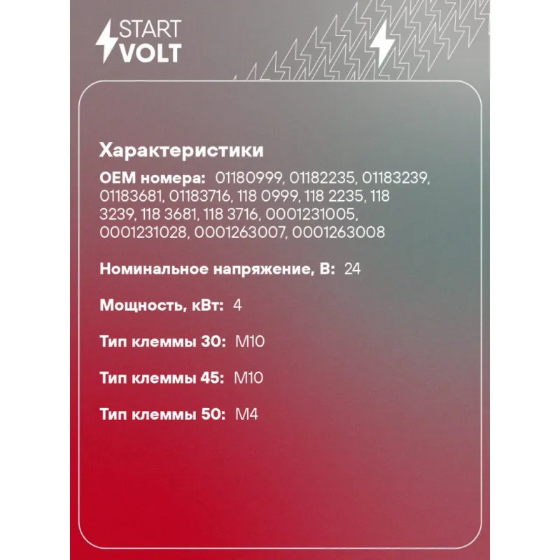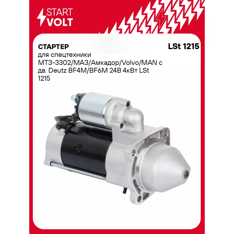 Стартер для спецтехники МТЗ-3302/МАЗ/Амкадор/Volvo/MAN с дв. Deutz BF4M/BF6M 24В 4кВт Описание: Оригинальный стартер STARTVOLT LSt 1215 мощностью 4 кВт предназначен для пуска автомобильного двигателя внутреннего сгорания. Предназначен для автомобилей . Подбор по VIN-номеру вашего автомобиля - через кнопку 'Задать вопрос'. Специалист проверит применяемость и ответит вам. Полностью повторяет параметры оригинальных изделий, обеспечивая надёжный запуск двигателя при любых условиях. Изготовлен с соблюдением оригинальных геометрических параметров, полностью совместим с заводскими узлами. Преимущества: • Полное соответствие оригинальным узлам; • Совместим с оригинальными деталями; • Длительный срок службы и устойчивость к износу; • Стабильная работа системы запуска; • Высокоточная сборка с пооперационным контролем качества; • Каждый стартер проходит стендовое тестирование — протокол в комплекте; • Надёжность при любом запуске двигателя; • STARTVOLT — 15 лет на рынке автоэлектрики — нам доверяют профессионалы; • Сертифицирован по стандарту EAC (ЕАЭС) — соответствует требованиям безопасности и качества. Товар новый, не восстановленный. Готов к установке. Отличный выбор для уверенного запуска двигателя в любых условиях. Характеристики: Артикул: LSt 1215 OEM номера: 01180999, 01182235, 01183239, 01183681, 01183716, 118 0999, 118 2235, 118 3239, 118 3681, 118 3716, 0001231005, 0001231028, 0001263007, 0001263008, 0001263051, 0001263052 Номинальное напряжение, В: 24 Количество зубьев: 9 Направление вращения: по часовой стрелке Мощность, кВт: 4 Тип клеммы 30: M10 Тип клеммы 45: M10 Тип клеммы 50: M4 Количество резьбовых соединений: 0 Диаметр фланца, мм: 89 Исходное положение шестерни, мм: 28 Количество монтажных отверстий: 3 Количество на автомобиль: 1 Комплектация: Индивидуальный технический паспорт - 1 шт Стартер - 1 шт Паспорт изделия/гарантийный талон - 1 шт Гарантия: от 1 года.