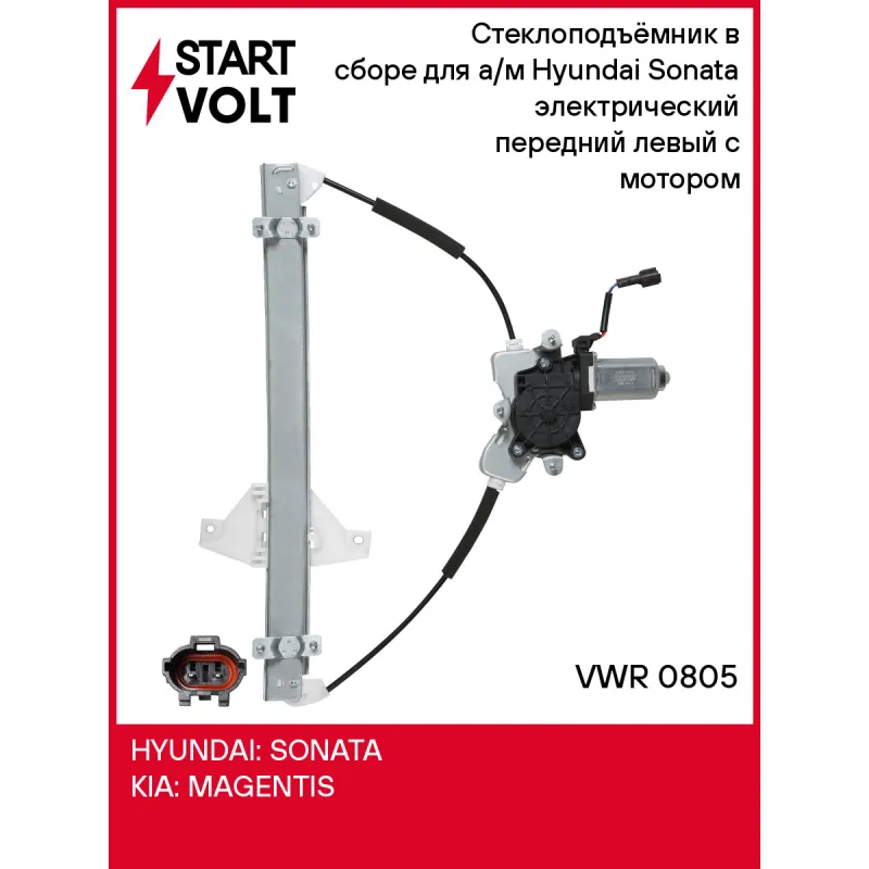 Стеклоподъёмник в сборе для а/м Hyundai Sonata (98-) электрический передний левый с мотором Характеристики: Артикул: VWR 0805 OEM номера: 8240338011, 82403-3C010, 82403-38010 Количество на автомобиль: 1 Сила тока, А: 6 Усилие при закрытии, Н: 150-320 Время закрытия, С: 2-5 Сторона установки: Спереди слева Комплектация: Стеклоподъёмник в сборе - 1 шт Паспорт изделия/гарантийный Гарантия: от 1 года.