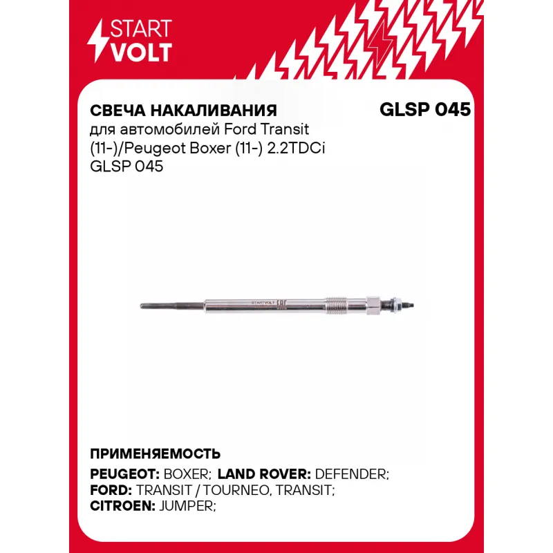 Свеча накаливания для автомобилей Ford Transit (11-)/Peugeot Boxer (11-) 2.2TDCi Характеристики: Артикул: GLSP 045 OEM номера: 96 756 809 80, 1717 631, BK3Q-6M090-AB, 0 250 403 024, 0 250 203 018, DG-611, 93337, Y1045AS, D-Power 89 Напряжение, В: 4,4 Резьба: М10х1 Покатность конуса, град: 93 Тип и размер подключения: M4 Монтажная глубина, мм: 35 Момент затяжки, нм: 10-12 Ширина ключа: 10 Общая длина, мм: 148 Комплектация: Гайка - 1 шт Свеча накаливания - 1 шт Паспорт изделия/гарантийный талон - 1 шт Гарантия: от 1 года.