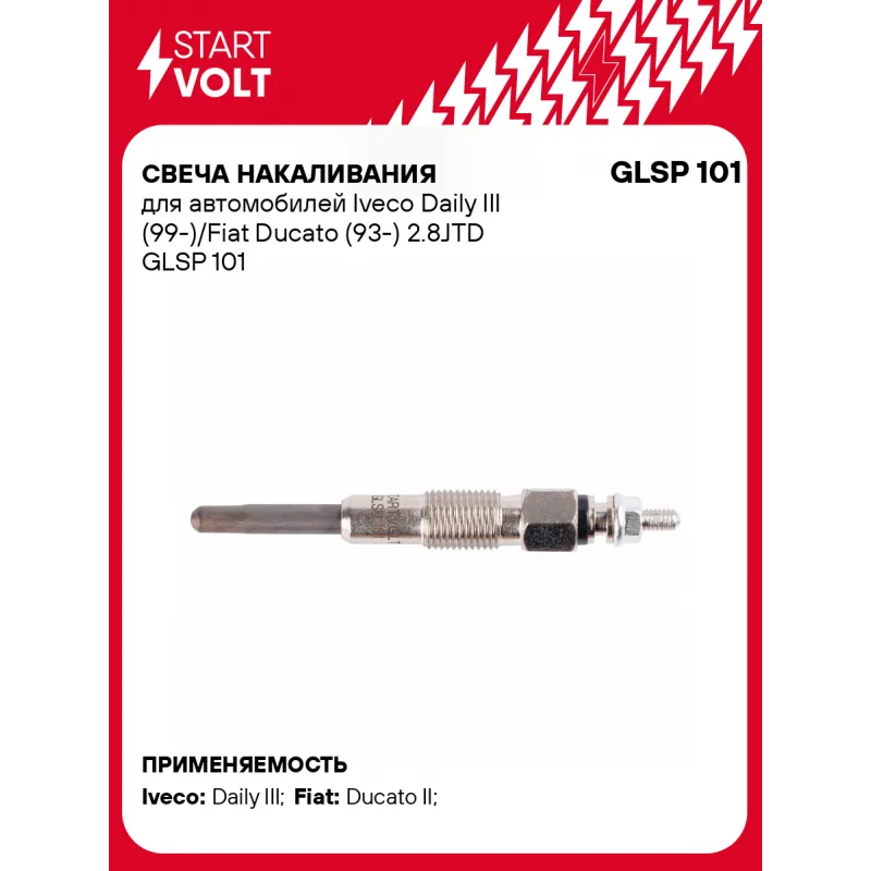 Свеча накаливания для автомобилей Iveco Daily III (99-)/Fiat Ducato (93-) 2.8JTD Характеристики: Артикул: GLSP 101 OEM номера: 4832279, 16 104 299 80, 16 160 600 80, 5960 71, 5960 72, 5960 K5, 5962 5A, 500316493, 0 250 202 002, DG-111, 3852, Y-502R Напряжение, В: 11 Резьба: M10x1 Покатность конуса, град: 63 Тип и размер подключения: M4 Монтажная глубина, мм: 24,5 Момент затяжки, нм: 10-12 Ширина ключа: 10 Общая длина, мм: 76 Подходит для авто: Iveco Daily III (99-) Fiat Ducato II (94-) Для проверки применяемости отправьте VIN автомобиля через вкладку "Есть вопросы о товаре?" Комплектация: Гайка - 1 шт Свеча накаливания - 1 шт Паспорт изделия/гарантийный талон - 1 шт Гарантия: от 1 года.