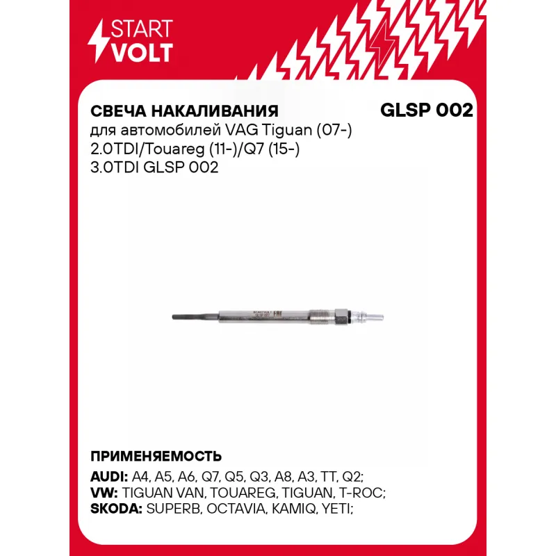 Свеча накаливания для автомобилей VAG Tiguan (07-) 2.0TDI/Touareg (11-)/Q7 (15-) 3.0TDI Характеристики: Артикул: GLSP 002 OEM номера: 65268030009, 65268030005, 65268030008, 958 170 320 91, 958 170 320 90, 955 170 320 90, 059 963 319 E, 059 963 319 F, 03L 963 319 A, 03L 963 319 C, 060 963 319 F, 04L 963 319 D, 04L 963 319 E, 03L 963 319 D, 04L 963 319 B, 03L 963 319, 059 998 319, 0 250 403 009, DG-193, Y-609AS, D-Power 49, 5849, 8888, Y1002AS, D-Power 57 Напряжение, В: 4,4 Резьба: М10х1 Покатность конуса, град: 63 Тип и размер подключения: PIN 4 Монтажная глубина, мм: 28 Момент затяжки, нм: 10-12 Ширина ключа: 10 Общая длина, мм: 126,4 Комплектация: Гайка - 1 шт Свеча накаливания - 1 шт Паспорт изделия/гарантийный талон - 1 шт Гарантия: от 1 года.