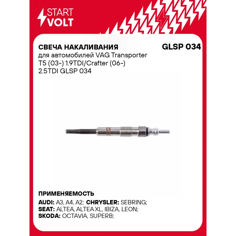 Свеча накаливания для автомобилей VAG Transporter T5 (03-) 1.9TDI/Crafter (06-) 2.5TDI Характеристики: Артикул: GLSP 034 OEM номера: N 105 916 02, N 105 916 03, 0 250 402 005, DG-177, Y-607AS, 7560, D-Power 50 Напряжение, В: 5 Резьба: М10х1 Покатность конуса, град: 63 Тип и размер подключения: PIN 4 Монтажная глубина, мм: 29 Момент затяжки, нм: 10-12 Ширина ключа: 10 Общая длина, мм: 97 Комплектация: Гайка - 1 шт Свеча накаливания - 1 шт Паспорт изделия/гарантийный талон - 1 шт Гарантия: от 1 года.