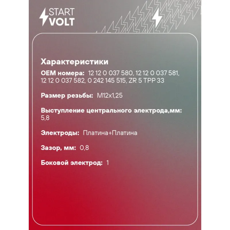 Свеча зажигания для автомобилей BMW X5 E70 (10-) 3.0i/7 F01 (08-) 4.4i Pt+Pt Описание: Гарантийный срок - 2 года. Характеристики: Артикул: VSP 2614 OEM номера: 12 12 0 037 580, 12 12 0 037 581, 12 12 0 037 582, 0 242 145 515, ZR 5 TPP 33 Резистор: Есть Момент затяжки, нм: 20-25 Ширина ключа,мм: 14 Размер резьбы: M12x1,25 Длина резьбы,мм: 26,5 Выступление центрального электрода,мм: 5,8 Боковой электрод: 1 Электроды: Платина+Платина Зазор, мм: 0,8 Маркировка: PPLDAP7SHR-P Комплектация: Свеча зажигания - 1 шт Гарантия: от 1 года.