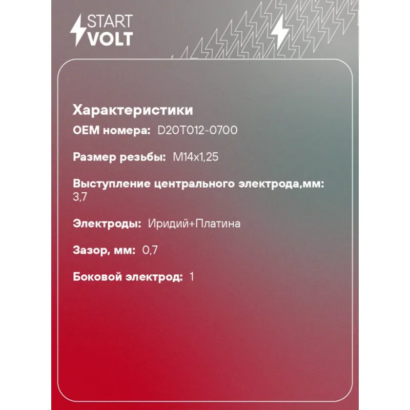 Свеча зажигания для автомобилей Changan Uni-K (22-) 2.0T Ir+Pt Описание: Гарантийный срок - 2 года. Характеристики: Артикул: VSP 2716 OEM номера: D20T012-0700 Резистор: Есть Момент затяжки, нм: 25-30 Ширина ключа,мм: 16 Размер резьбы: M14x1,25 Длина резьбы,мм: 19 Выступление центрального электрода,мм: 3,7 Боковой электрод: 1 Электроды: Иридий+Платина Зазор, мм: 0,7 Маркировка: IPKP6AR-P7 Комплектация: Свеча зажигания - 1 шт Гарантия: от 1 года.