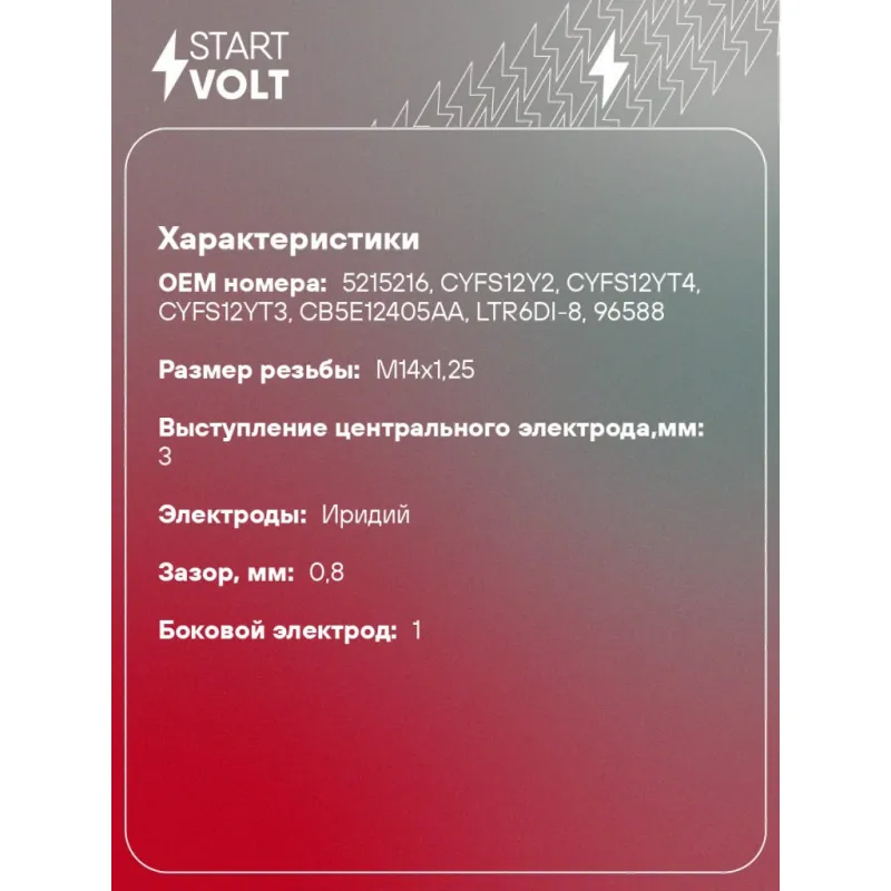 Свеча зажигания для автомобилей Ford Mondeo IV (10-)/Mondeo V (15-) 2.0T Ir Описание: Гарантийный срок - 2 года. Характеристики: Артикул: VSP 1023 OEM номера: 5215216, CYFS12Y2, CYFS12YT4, CYFS12YT3, CB5E12405AA, LTR6DI-8, 96588 Размер резьбы: M14x1,25 Резистор: Есть Момент затяжки, нм: 15-20 Ширина ключа,мм: 16 Длина резьбы,мм: 25 Выступление центрального электрода,мм: 3 Электроды: Иридий Зазор, мм: 0,8 Боковой электрод: 1 Маркировка: IQHP6AR Комплектация: Свеча зажигания - 1 шт Гарантия: от 1 года.