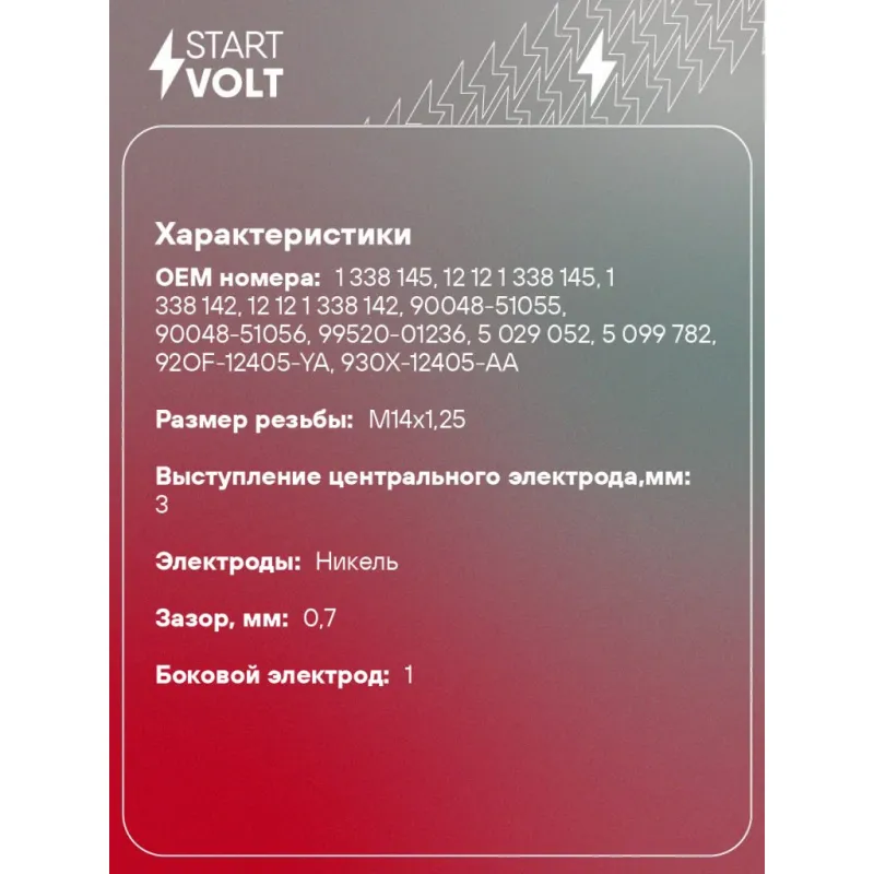 Свеча зажигания для автомобилей Лада 2101-2107 карб. (зазор 0,7мм) Описание: Гарантийный срок - 2 года. Характеристики: Артикул: VSP 0102 OEM номера: 1 338 145, 12 12 1 338 145, 1 338 142, 12 12 1 338 142, 90048-51055, 90048-51056, 99520-01236, 5 029 052, 5 099 782, 92OF-12405-YA, 930X-12405-AA, 98079-56854, 98079-568-21, 98079-568-211H, 98079-568-5400, 5-81380006-0, А17ДВ-10, 2101-3707000-60, 21013707010, 21013707000, A502 18 110, MS851433, MD851023, MS851023, MS851283, MS851438, MS851438A, MS851438E, MS851438K, RTC3812, GSP4362, NLP10010, 22401-AA130, 22401-AA030, 420545502, 09482-00193, 09482-00392, 04195-34020, 90098-20695, 90999-09001, 7529, BP6ES, L45PW, 4238208, 1307867710, 9079E-ND022, 947-00002-01, 947-03002-01, 92070-1028, J4520W20EPU, W20EP-U, 3043 Резистор: Нет Момент затяжки, нм: 25-30 Ширина ключа,мм: 20,6 Размер резьбы: M14x1,25 Длина резьбы,мм: 19 Выступление центрального электрода,мм: 3 Боковой электрод: 1 Электроды: Никель Зазор, мм: 0,7 Маркировка: NFP6-V7 Комплектация: Свеча зажигания - 1 шт Паспорт изделия/гарантийный талон Гарантия: от 1 года.