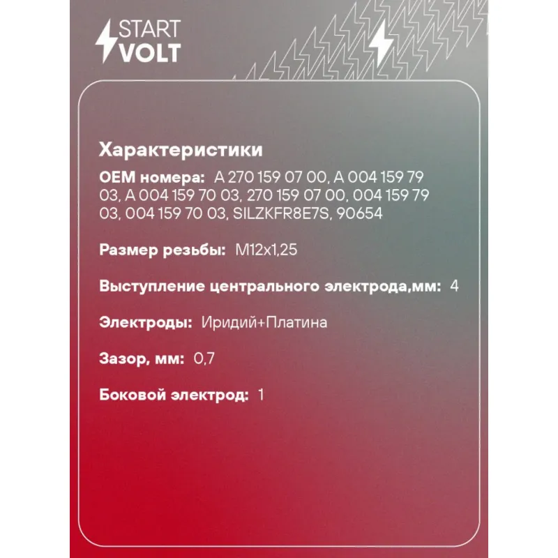 Свеча зажигания для автомобилей Mercedes-Benz GLC X253 (15-)/E W213 (15-) 2.0i Описание: Гарантийный срок - 2 года. Характеристики: Артикул: VSP 1504 OEM номера: A 270 159 07 00, A 004 159 79 03, A 004 159 70 03, 270 159 07 00, 004 159 79 03, 004 159 70 03, SILZKFR8E7S, 90654 Резистор: Есть Момент затяжки, нм: 20-25 Ширина ключа,мм: 14 Размер резьбы: M12x1,25 Длина резьбы,мм: 26,5 Выступление центрального электрода,мм: 4 Боковой электрод: 1 Электроды: Иридий+Платина Зазор, мм: 0,7 Маркировка: IPLDP8LSYER-P7 Комплектация: Свеча зажигания - 1 шт Паспорт изделия/гарантийный талон Гарантия: от 1 года.