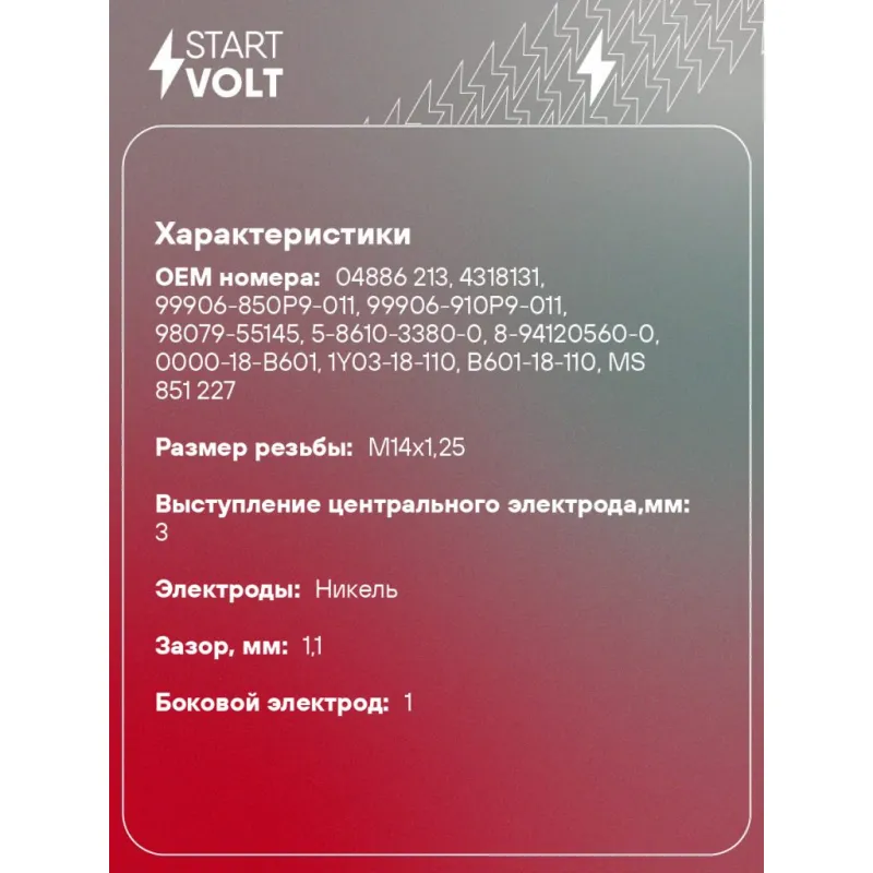 Свеча зажигания для автомобилей Mitsubishi Pajero II (90-) 3.0i/Lancer VI (95-) 1.3i Описание: Гарантийный срок - 2 года. Характеристики: Артикул: VSP 1111 OEM номера: 04886 213, 4318131, 99906-850P9-011, 99906-910P9-011, 98079-55145, 5-8610-3380-0, 8-94120560-0, 0000-18-B601, 1Y03-18-110, B601-18-110, MS 851 227, MS 851 237, MS 851 417, 22401-01B14, 22401-P8315, 22401-P8385-PC, 22401-P8390, 22401AA480, 18811-11051, 4424, BPR5ES-11, W 16 EPR-U 11, W 16 EPR 11, D 100 Резистор: Есть Момент затяжки, нм: 25-30 Ширина ключа,мм: 20,6 Размер резьбы: M14x1,25 Длина резьбы,мм: 19 Выступление центрального электрода,мм: 3 Боковой электрод: 1 Электроды: Никель Зазор, мм: 1,1 Маркировка: NFP5R-11 Комплектация: Паспорт изделия/гарантийный талон Свеча зажигания - 1 шт Гарантия: от 1 года.
