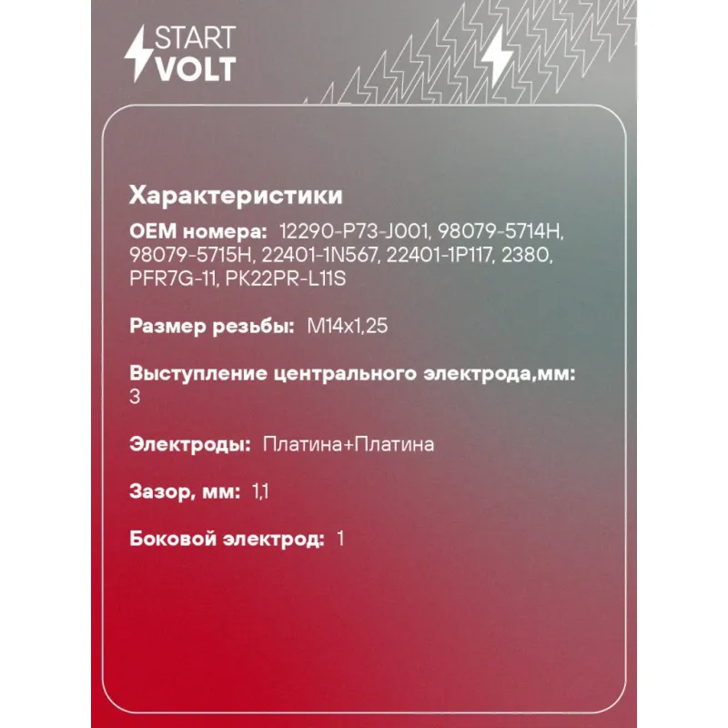Свеча зажигания для автомобилей Nissan Cefiro II (94-)/Primera P11 (96-) 2.0i Pt+Pt Описание: Гарантийный срок - 2 года. Характеристики: Артикул: VSP 1430 OEM номера: 12290-P73-J001, 98079-5714H, 98079-5715H, 22401-1N567, 22401-1P117, 2380, PFR7G-11, PK22PR-L11S Резистор: Есть Момент затяжки, нм: 25-30 Ширина ключа,мм: 16 Размер резьбы: M14x1,25 Длина резьбы,мм: 19 Выступление центрального электрода,мм: 3 Боковой электрод: 1 Электроды: Платина+Платина Зазор, мм: 1,1 Маркировка: PPKP7R-P11 Комплектация: Паспорт изделия/гарантийный талон Свеча зажигания - 1 шт Гарантия: от 1 года.