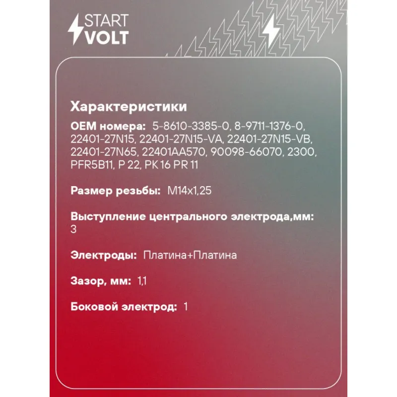 Свеча зажигания для автомобилей Subaru Outback (03-) 2.5T/Hyundai Sonata EF (01-) 2.7i Pt+Pt Описание: Гарантийный срок - 2 года. Характеристики: Артикул: VSP 2204 OEM номера: 22401AA570, 90098-66070, 22401-27N15, 22401-27N15-VA, 22401-27N15-VB, 22401-27N65, 5-8610-3385-0, 8-9711-1376-0, PFR5B-11, 2300, P 22, PK 16 PR 11 Резистор: Есть Момент затяжки, нм: 25-30 Ширина ключа,мм: 16 Размер резьбы: M14x1,25 Длина резьбы,мм: 19 Выступление центрального электрода,мм: 3 Боковой электрод: 1 Электроды: Платина+Платина Зазор, мм: 1,1 Маркировка: PPKP5AR-P11 Комплектация: Свеча зажигания - 1 шт Паспорт изделия/гарантийный талон Гарантия: от 1 года.