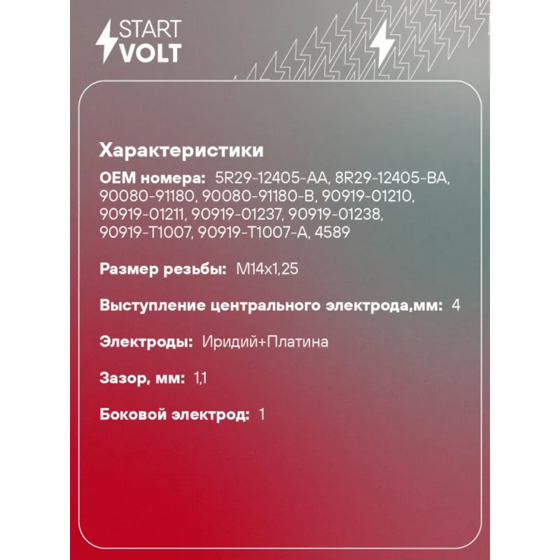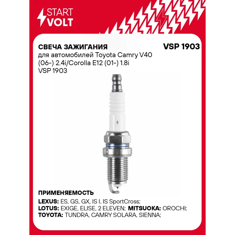 Свеча зажигания для автомобилей Toyota Camry V40 (06-) 2.4i/Corolla E12 (01-) 1.8i Описание: Гарантийный срок - 2 года. Характеристики: Артикул: VSP 1903 OEM номера: 90080-91180, 90080-91180-B, 90919-01210, 90919-01211, 90919-01237, 90919-01238, 90919-T1007, 90919-T1007-A, 5R29-12405-AA, 8R29-12405-BA, IFR6T11, 4589, SK20R11 Резистор: Есть Момент затяжки, нм: 25-30 Ширина ключа,мм: 16 Размер резьбы: M14x1,25 Длина резьбы,мм: 19 Выступление центрального электрода,мм: 4 Боковой электрод: 1 Электроды: Иридий+Платина Зазор, мм: 1,1 Маркировка: IPKP6AR-P11 Комплектация: Паспорт изделия/гарантийный талон Свеча зажигания - 1 шт Гарантия: от 1 года.