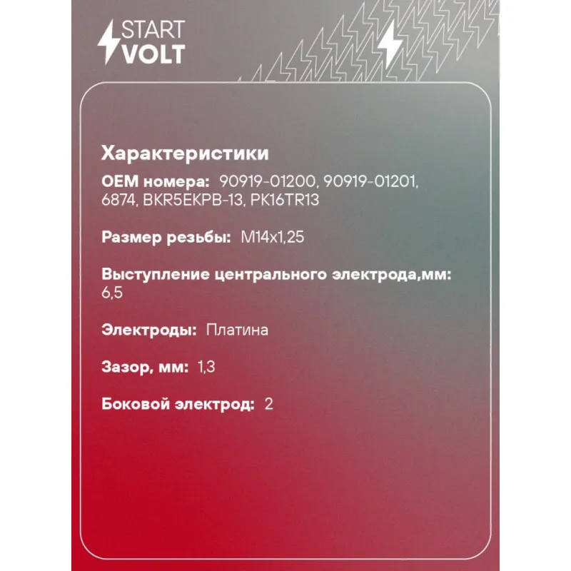 Свеча зажигания для автомобилей Toyota Corona E (92-)/Caldina T21 (97-) 1.8i Pt Описание: Гарантийный срок - 2 года. Характеристики: Артикул: VSP 1917 OEM номера: 90919-01200, 90919-01201, 6874, BKR5EKPB-13, PK16TR13 Резистор: Есть Момент затяжки, нм: 25-30 Ширина ключа,мм: 16 Размер резьбы: M14x1,25 Длина резьбы,мм: 19 Выступление центрального электрода,мм: 6,5 Боковой электрод: 2 Электроды: Платина Зазор, мм: 1,3 Маркировка: PKU5DR-13 Комплектация: Свеча зажигания - 1 шт Паспорт изделия/гарантийный талон Гарантия: от 1 года.