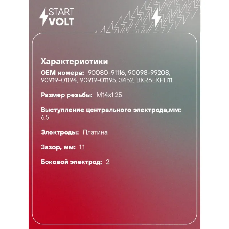 Свеча зажигания для автомобилей Toyota Harrier (97-) 2.2i/RAV4 (94-) 2.0i Pt Описание: Гарантийный срок - 2 года. Характеристики: Артикул: VSP 1924 OEM номера: 90080-91116, 90098-99208, 90919-01194, 90919-01195, 3452, BKR6EKPB-11 Резистор: Есть Момент затяжки, нм: 25-30 Ширина ключа,мм: 16 Размер резьбы: M14x1,25 Длина резьбы,мм: 19 Выступление центрального электрода,мм: 6,5 Боковой электрод: 2 Электроды: Платина Зазор, мм: 1,1 Маркировка: PKU6DR-11 Комплектация: Паспорт изделия/гарантийный талон Свеча зажигания - 1 шт Гарантия: от 1 года.