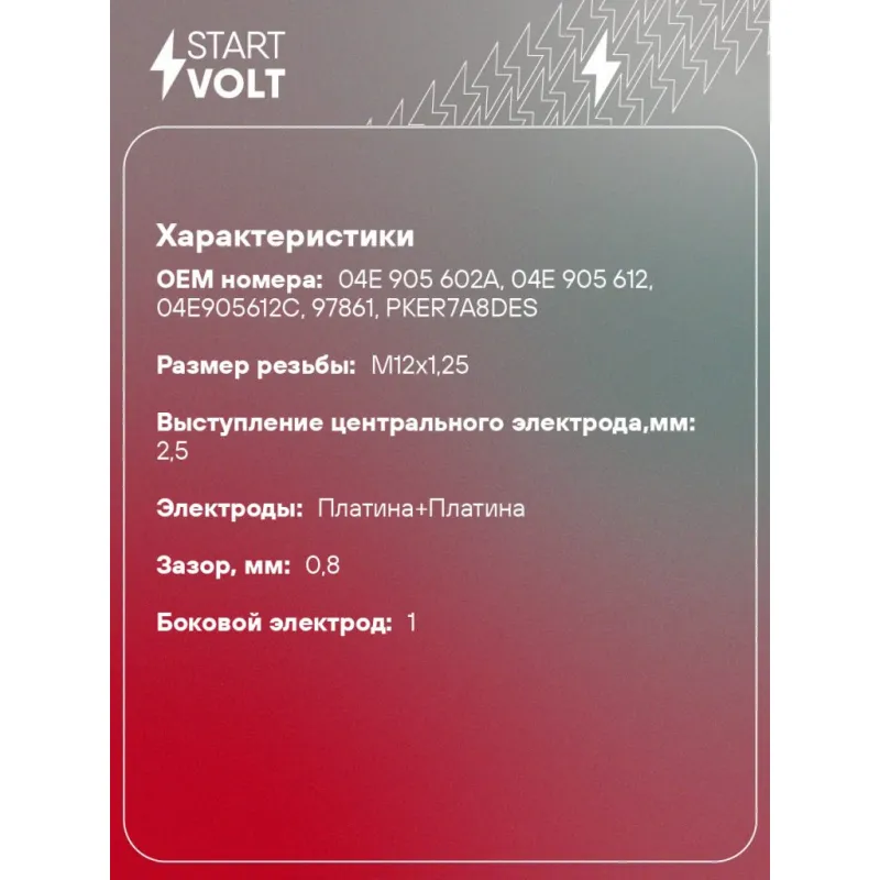 Свеча зажигания для автомобилей VAG Caddy IV (15-) 1.4TGI CNG Pt+Pt VSP 1829 StartVolt