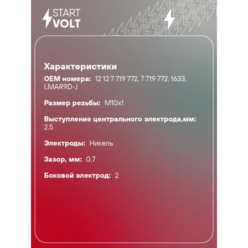 Свеча зажигания для мототехники BMW G310 (15-)/HP4 (12-)/S1000 (09-) ан. LMAR9D-J Описание: Гарантийный срок - 2 года. Характеристики: Артикул: VSP 3553 OEM номера: 12 12 7 719 772, 7 719 772, 1633, LMAR9D-J Резистор: Есть Момент затяжки, нм: 10-15 Ширина ключа,мм: 14 Размер резьбы: M10x1 Длина резьбы,мм: 26,5 Выступление центрального электрода,мм: 2,5 Боковой электрод: 2 Электроды: Никель Зазор, мм: 0,7 Маркировка: NLCU9DR Комплектация: Свеча зажигания - 1 шт Паспорт изделия/гарантийный талон Гарантия: от 1 года.
