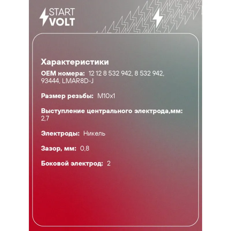 Свеча зажигания для мототехники BMW R1200/C600/650 ан. LMAR8D-J Описание: Гарантийный срок - 2 года. Характеристики: Артикул: VSP 3016 OEM номера: 12 12 8 532 942, 8 532 942, 93444, LMAR8D-J Размер резьбы: M10x1 Резистор: Есть Момент затяжки, нм: 7-12 Ширина ключа,мм: 14 Длина резьбы,мм: 26,5 Выступление центрального электрода,мм: 2,7 Электроды: Никель Зазор, мм: 0,8 Боковой электрод: 2 Маркировка: NLC8DR Комплектация: Свеча зажигания - 1 шт Гарантия: от 1 года.