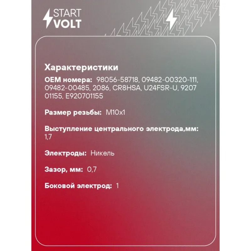 Свеча зажигания для мототехники Honda/Kawasaki/Suzuki/Yamaha ан. CR8HSA Характеристики: Артикул: VSP 3592 OEM номера: 98056-58718, 09482-00320-111, 09482-00485, 2086, CR8HSA, U24FSR-U, 9207 01155, E920701155 Резистор: Есть Момент затяжки, нм: 10-15 Ширина ключа,мм: 16 Размер резьбы: M10x1 Длина резьбы,мм: 12,7 Выступление центрального электрода,мм: 1,7 Боковой электрод: 1 Электроды: Никель Зазор, мм: 0,7 Маркировка: NAP8R-7 Комплектация: Свеча зажигания - 1 шт Паспорт изделия/гарантийный талон Гарантия: от 1 года.