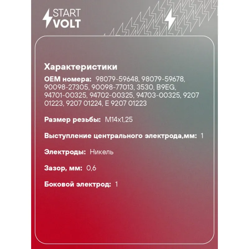 Свеча зажигания для мототехники Kawasaki/Suzuki/Yamaha/KTM ан. B9EG Характеристики: Артикул: VSP 3569 OEM номера: 98079-59648, 98079-59678, 90098-27305, 90098-77013, 3530, B9EG, 94701-00325, 94702-00325, 94703-00325, 9207 01223, 9207 01224, E 9207 01223, E 9207 01224 Резистор: Нет Момент затяжки, нм: 25-30 Ширина ключа,мм: 20,6 Размер резьбы: M14x1,25 Длина резьбы,мм: 19 Выступление центрального электрода,мм: 1 Боковой электрод: 1 Электроды: Никель Зазор, мм: 0,6 Маркировка: NF9-6 Комплектация: Свеча зажигания - 1 шт Паспорт изделия/гарантийный талон Гарантия: от 1 года.