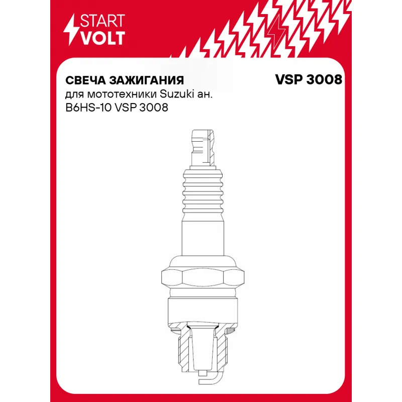 Свеча зажигания для мототехники Suzuki ан. B6HS-10 Описание: Гарантийный срок - 2 года. Характеристики: Артикул: VSP 3008 OEM номера: 09482-00338, 09482-00339, 09482-00534, 896 322, 1052, B6HS-10, W 20 FSU 10, 94701 00273, 94702-00273, 94703-00273, W 20 FP-U Резистор: Нет Момент затяжки, нм: 25-30 Ширина ключа,мм: 20,6 Размер резьбы: M14x1,25 Длина резьбы,мм: 12,7 Выступление центрального электрода,мм: 1,2 Боковой электрод: 1 Электроды: Никель Зазор, мм: 1 Маркировка: NE6-10 Комплектация: Свеча зажигания - 1 шт Гарантия: от 1 года.