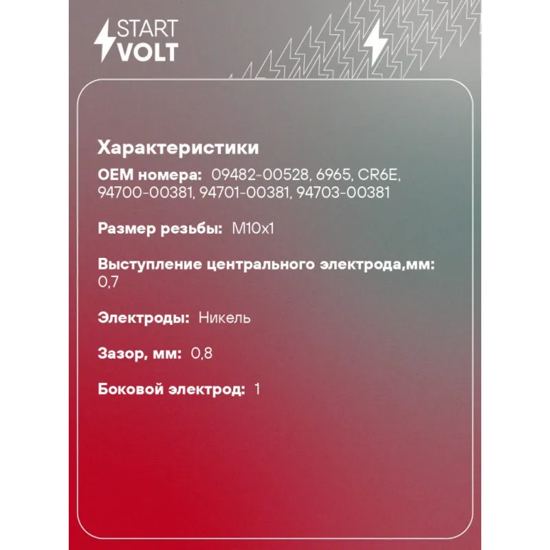 Свеча зажигания для мототехники Suzuki VZ (10-) ан. CR6E Описание: Гарантийный срок - 2 года. Характеристики: Артикул: VSP 3583 OEM номера: 09482-00528, 6965, CR6E, 94700-00381, 94701-00381, 94703-00381 Резистор: Есть Момент затяжки, нм: 10-15 Ширина ключа,мм: 16 Размер резьбы: M10x1 Длина резьбы,мм: 19 Выступление центрального электрода,мм: 0,7 Боковой электрод: 1 Электроды: Никель Зазор, мм: 0,8 Маркировка: NB6R Комплектация: Свеча зажигания - 1 шт Гарантия: от 1 года.