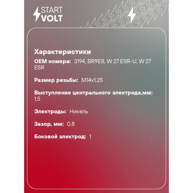 Свеча зажигания для мототехники Yamaha/Acrctic Cat/Polaris/Bombardier ан. BR9ES Описание: Гарантийный срок - 2 года. Характеристики: Артикул: VSP 3501 OEM номера: 3194, BR9ES, W 27 ESR-U, W 27 ESR Резистор: Есть Момент затяжки, нм: 25-30 Ширина ключа,мм: 20,6 Размер резьбы: M14x1,25 Длина резьбы,мм: 19 Выступление центрального электрода,мм: 1,5 Боковой электрод: 1 Электроды: Никель Зазор, мм: 0,8 Маркировка: NF9R Комплектация: Свеча зажигания - 1 шт Паспорт изделия/гарантийный талон Гарантия: от 1 года.