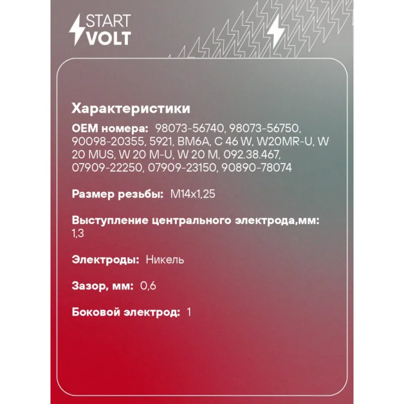 Свеча зажигания для садовой техники ан. BM6A Описание: Гарантийный срок - 2 года. Характеристики: Артикул: VSP 3020 OEM номера: 98073-56740, 98073-56750, 90098-20355, 5921, BM6A, C 46 W, W20MR-U, W 20 MUS, W 20 M-U, W 20 M, 092.38.467, 07909-22250, 07909-23150, 90890-78074, 90890-78102, 9207 02051, E 9207 02051 Резистор: Нет Момент затяжки, нм: 25-30 Ширина ключа,мм: 19 Размер резьбы: M14x1,25 Длина резьбы,мм: 9,5 Выступление центрального электрода,мм: 1,3 Боковой электрод: 1 Электроды: Никель Зазор, мм: 0,6 Маркировка: NGKM6-6 Комплектация: Свеча зажигания - 1 шт Гарантия: от 1 года.