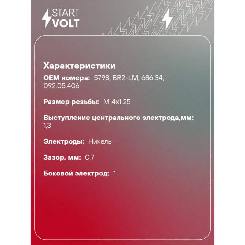 Свеча зажигания для садовой техники ан. BR2-LM Описание: Гарантийный срок - 2 года. Характеристики: Артикул: VSP 3542 OEM номера: 5798, BR2-LM, 686 34, 092.05.406 Резистор: Есть Момент затяжки, нм: 25-30 Ширина ключа,мм: 20,6 Размер резьбы: M14x1,25 Длина резьбы,мм: 9,5 Выступление центрального электрода,мм: 1,3 Боковой электрод: 1 Электроды: Никель Зазор, мм: 0,7 Маркировка: NGLM2R-7 Комплектация: Свеча зажигания - 1 шт Паспорт изделия/гарантийный талон Гарантия: от 1 года.