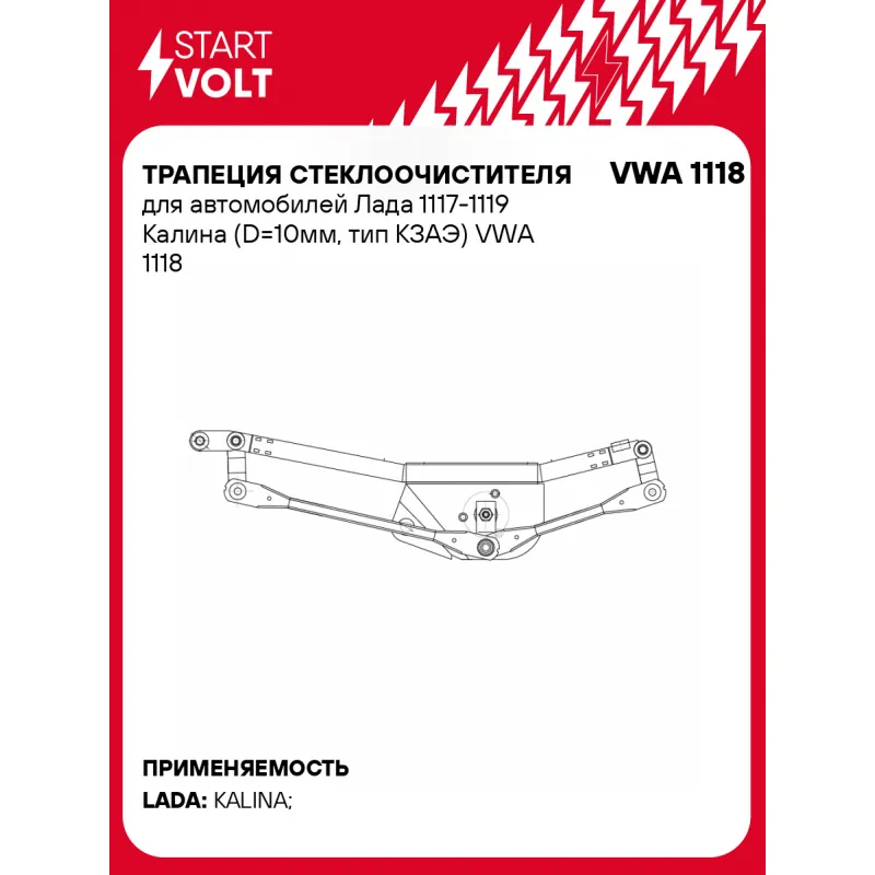 Трапеция стеклоочистителя для автомобилей Лада 1117-1119 Калина (D=10мм, тип КЗАЭ) Характеристики: Артикул: VWA 1118 OEM номера: 95.5205100 Материал: Штампованная сталь Сопутствующий товар: Моторедукторы переднего стеклоочистителя: VWF 0110 Количество на автомобиль: 1 Комплектация: Паспорт изделия/гарантийный талон - 1 шт Тра... Читать полностью →