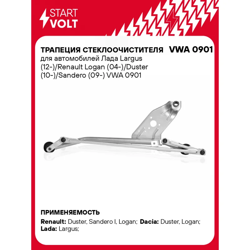 Трапеция стеклоочистителя для автомобилей Лада Largus (12-)/Renault Logan (04-)/Duster (10-)/Sandero (09-) Характеристики: Артикул: VWA 0901 OEM номера: 8200619512, 3397020879, 6001550803 Материал: Штампованная сталь Сопутствующий товар: Моторедукторы переднего стеклоочистителя: VWF 0902 Количество на автомобиль: 1 Подходит для авто: Renault Duster (10-), Sandero I (09-), Logan (04-), Duster (10-) Dacia Duster (10-), Logan (04-), Duster (10-) ВАЗ Largus (12-) Для проверки применяемости отправьте VIN автомобиля через вкладку "Есть вопросы о товаре?" Комплектация: Трапеция стеклоочистителя - 1 шт Паспорт изделия/гарантийный талон - 1 шт Гарантия: от 1 года.