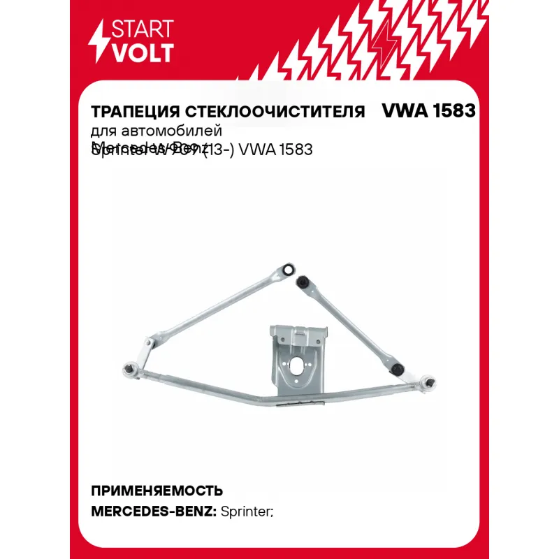 Трапеция стеклоочистителя для автомобилей Mercedes-Benz Sprinter W909 (13-) Характеристики: Артикул: VWA 1583 OEM номера: A 909 820 00 00, 9098200000 Материал: Штампованная сталь Количество на автомобиль: 1 Комплектация: Трапеция стеклоочистителя - 1 шт Паспорт изделия/гарантийный талон - 1 шт Гарантия: от 1 года.