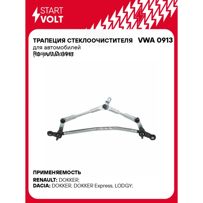 Трапеция стеклоочистителя для автомобилей Renault Dokker (13-) Характеристики: Артикул: VWA 0913 OEM номера: 288004287R Материал: Штампованная сталь Количество на автомобиль: 1 Комплектация: Трапеция стеклоочистителя - 1 шт Паспорт изделия/гарантийный талон - 1 шт Гарантия: от 1 года.