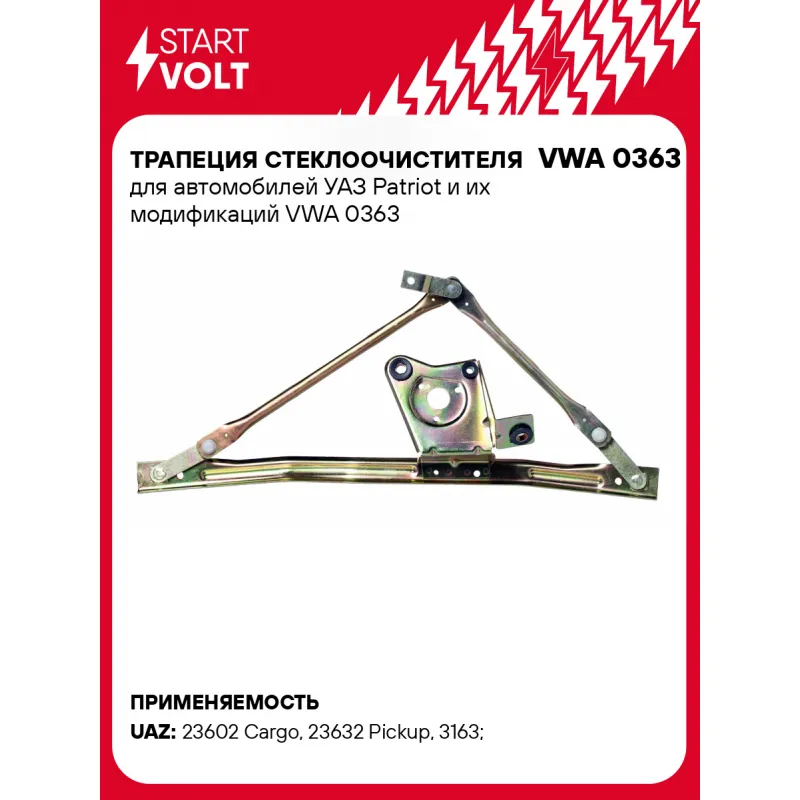 Трапеция стеклоочистителя для автомобилей УАЗ Patriot и их модификаций Характеристики: Артикул: VWA 0363 OEM номера: 3163-73.5205100, 73.5205100-40, 73.5205300, 3163-00-5205100-60 Материал: Штампованная сталь Сопутствующий товар: Моторедукторы переднего стеклоочистителя: VWF 0363 Количество на автомобиль: 1 Подходит для авто: УАЗ 23602 Cargo (08-), 23632 Pickup (08-), 3163 (Patriot) (05-) Для проверки применяемости отправьте VIN автомобиля через вкладку "Есть вопросы о товаре?" Комплектация: Паспорт изделия/гарантийный талон - 1 шт Трапеция стеклоочистителя - 1 шт Гарантия: от 1 года.