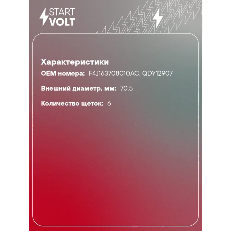 Узел щеточный стартера для автомобилей Chery Tiggo 7 Pro Max (23-)/Omoda C5 (21-) 1.6TGDi Характеристики: Артикул: VBS 2742 OEM номера: F4J163708010AC, QDY12907 Внешний диаметр, мм: 70,5 Размер щетки: 16,3x4,6 Резьба: null Количество щеток: 6 Количество на автомобиль: 1 Комплектация: Щеточный узел - 1 шт Паспорт изделия/гарантийный талон Гарантия: от 1 года.