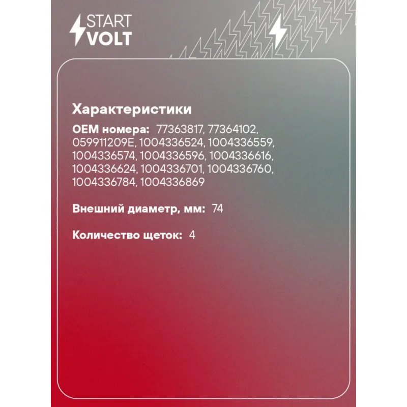 Узел щеточный стартера для автомобилей Ford Transit (06-) 2.2D Характеристики: Артикул: VBS 1020 OEM номера: 77363817, 77364102, 059911209E, 1004336524, 1004336559, 1004336574, 1004336596, 1004336616, 1004336624, 1004336701, 1004336760, 1004336784, 1004336869 Размер щетки: 18x6 Количество на автомобиль: 1 Количество щеток: 4 Внешний диаметр, мм: 74 Резьба: M4 Комплектация: Паспорт изделия/гарантийный талон Щеточный узел - 1 шт Гарантия: от 1 года.