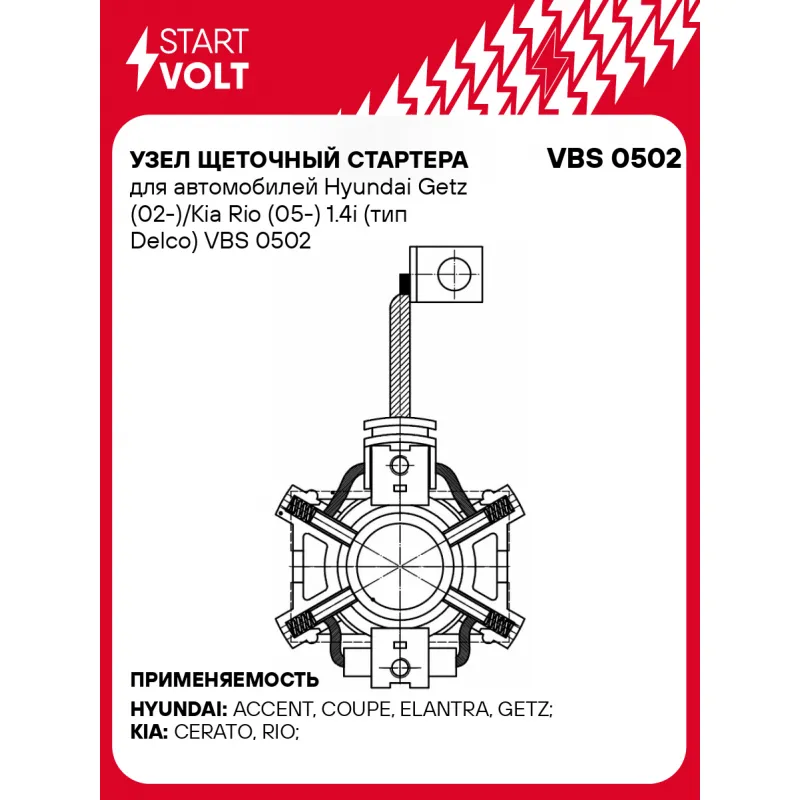 Узел щеточный стартера для автомобилей Hyundai Getz (02-)/Kia Rio (05-) 1.4i (тип Delco) Характеристики: Артикул: VBS 0502 OEM номера: 3617026850, 3617026851, 10515785 Внешний диаметр, мм: 68 Размер щетки: 13x4 Резьба: M5 Количество на автомобиль: 1 Количество щеток: 4 Комплектация: Паспорт изделия/гарантийный талон Щеточный узел - 1 шт Гарантия: от 1 года.
