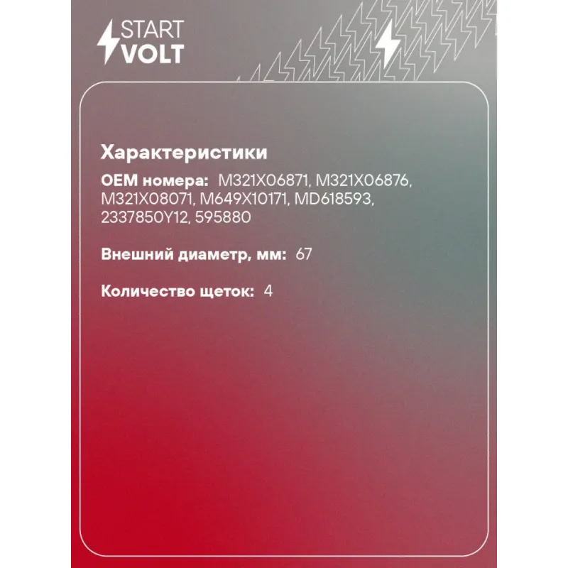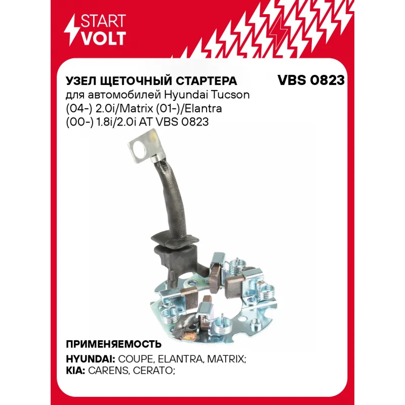 Узел щеточный стартера для автомобилей Hyundai Tucson (04-) 2.0i/Matrix (01-)/Elantra (00-) 1.8i/2.0i AT Характеристики: Артикул: VBS 0823 OEM номера: M321X06871, M321X06876, M321X08071, M649X10171, MD618593, 2337850Y12, 595880 Размер щетки: 12x4,5 Количество на автомобиль: 1 Количество щеток: 4 Внешний диаметр, мм: 67 Резьба: M5 Комплектация: Щеточный узел - 1 шт Паспорт изделия/гарантийный талон Гарантия: от 1 года.