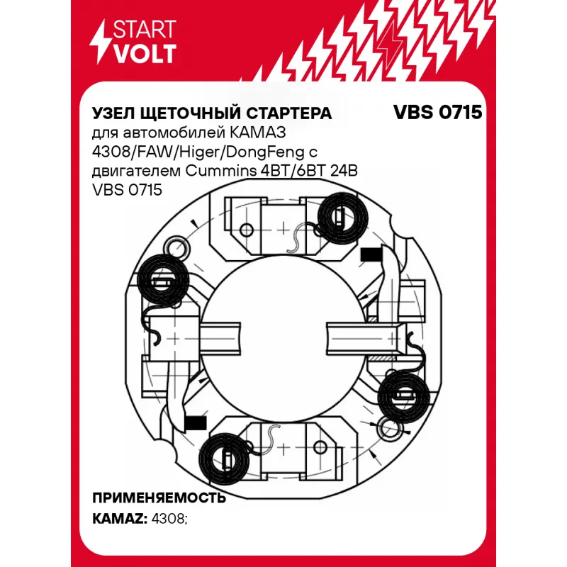 Узел щеточный стартера для автомобилей КАМАЗ 4308/FAW/Higer/DongFeng с двигателем Cummins 4BT/6BT 24В VBS 0715 StartVolt