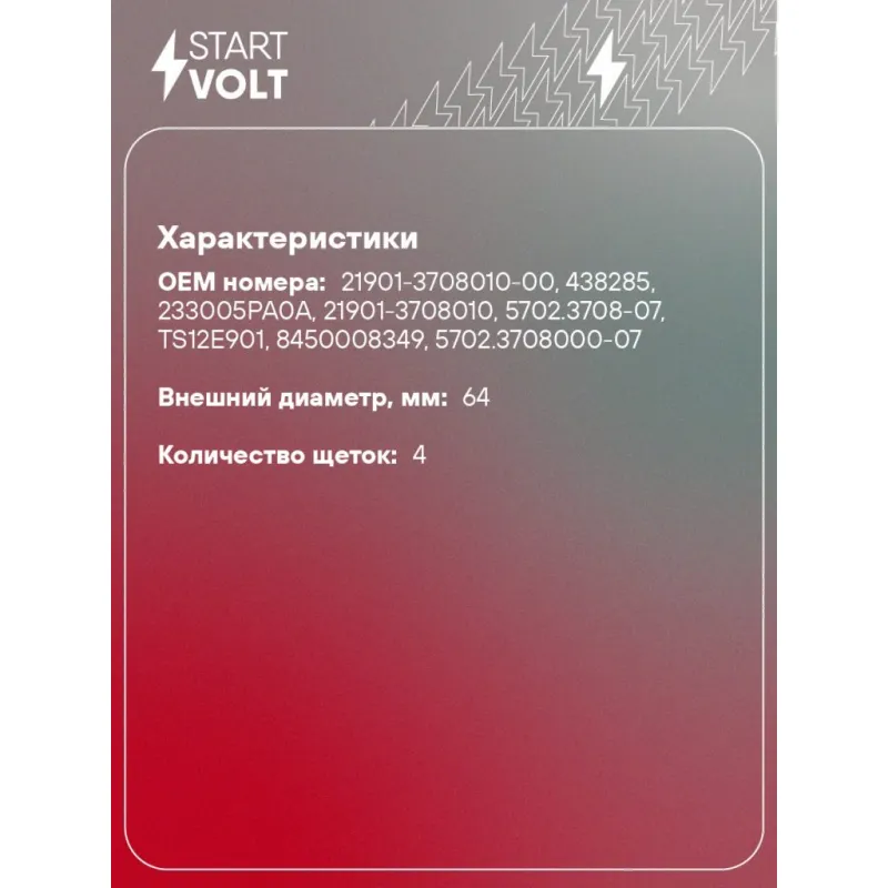 Узел щеточный стартера для автомобилей Лада Granta/Datsun on-DO/mi-DO MT (тип STARTVOLT) Характеристики: Артикул: VBS 0190 OEM номера: 21901-3708010-00, 438285, 233005PA0A, 21901-3708010, 5702.3708-07, TS12E901, 8450008349, 5702.3708000-07 Размер щетки: 12x4,7 Количество на автомобиль: 1 Количество щеток: 4 Внешний диаметр, мм: 64 Резьба: 5,5 Комплектация: Паспорт изделия/гарантийный талон Щеточный узел - 1 шт Гарантия: от 1 года.