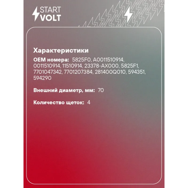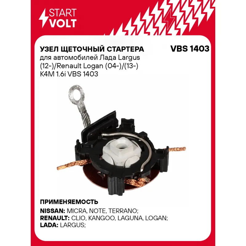 Узел щеточный стартера для автомобилей Лада Largus (12-)/Renault Logan (04-)/(13-) K4M 1.6i Характеристики: Артикул: VBS 1403 OEM номера: 5825F0, A0011510914, 0011510914, 11510914, 23378-AX000, 5825F1, 7701047342, 7701207384, 281400Q010, 594351, 594290 Размер щетки: 8x6,5 Количество на автомобиль: 1 Количество щеток: 4 Внешний диаметр, мм: 70 Резьба: null Комплектация: Щеточный узел - 1 шт Паспорт изделия/гарантийный талон Гарантия: от 1 года.