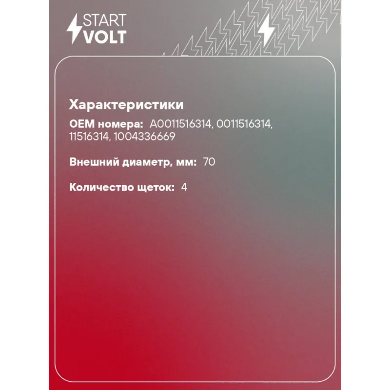 Узел щеточный стартера для автомобилей Mercedes-Benz Sprinter (06-) 2.1CDI Характеристики: Артикул: VBS 1502 OEM номера: A0011516314, 0011516314, 11516314, 1004336669 Внешний диаметр, мм: 70 Размер щетки: 18x6 Количество на автомобиль: 1 Количество щеток: 4 Резьба: M4 Комплектация: Паспорт изделия/гарантийный талон Щеточный у... Читать полностью →