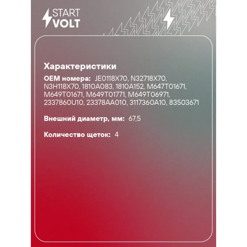 Узел щеточный стартера для автомобилей Mitsubishi Fuso Canter (12-) 3.0D Характеристики: Артикул: VBS 2500 OEM номера: JE0118X70, N32718X70, N3H118X70, 1810A083, 1810A152, M647T01671, M649T01671, M649T01771, M649T06971, 2337860U10, 23378AA010, 3117360A10, 83503671, F32Z11061B Размер щетки: 18x4,5 Количество на автомобиль: 1 Количество щеток: 4 Внешний диаметр, мм: 67,5 Резьба: M5 Комплектация: Паспорт изделия/гарантийный талон Щеточный узел - 1 шт Гарантия: от 1 года.
