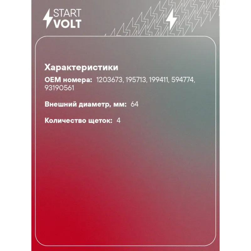 Узел щеточный стартера для автомобилей Opel Astra H (04-)/Corsa D (06-) 1.3CDTi Характеристики: Артикул: VBS 1604 OEM номера: 1203673, 195713, 199411, 594774, 93190561 Внешний диаметр, мм: 64 Размер щетки: 10x6,5 Резьба: 5,6 Количество на автомобиль: 1 Количество щеток: 4 Комплектация: Паспорт изделия/гарантийный талон Щеточный узел - 1 шт Гарантия: от 1 года.
