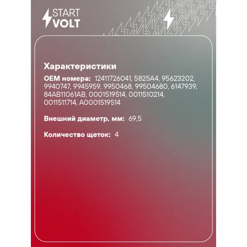 Узел щеточный стартера для автомобилей VAG 80 (86-)/100 (86-) 2.0i Характеристики: Артикул: VBS 1803 OEM номера: 12411726041, 5825A4, 95623202, 9940747, 9945959, 9950468, 99504680, 6147939, 84AB11061AB, 0001519514, 0011510214, 0011511714, A0001519514, A0011510214, A0011511714, 11510214, 11511714, 1519514, 1203011, 1203037, 7701042471, 281400B020, 059911209A, 068911209F, 068911209G, 068911209H, 6203017, 90510286, 93185012 Размер щетки: 18x6 Количество на автомобиль: 1 Количество щеток: 4 Внешний диаметр, мм: 69.5 Резьба: M4 Комплектация: Щеточный узел - 1 шт Паспорт изделия/гарантийный талон Гарантия: от 1 года.